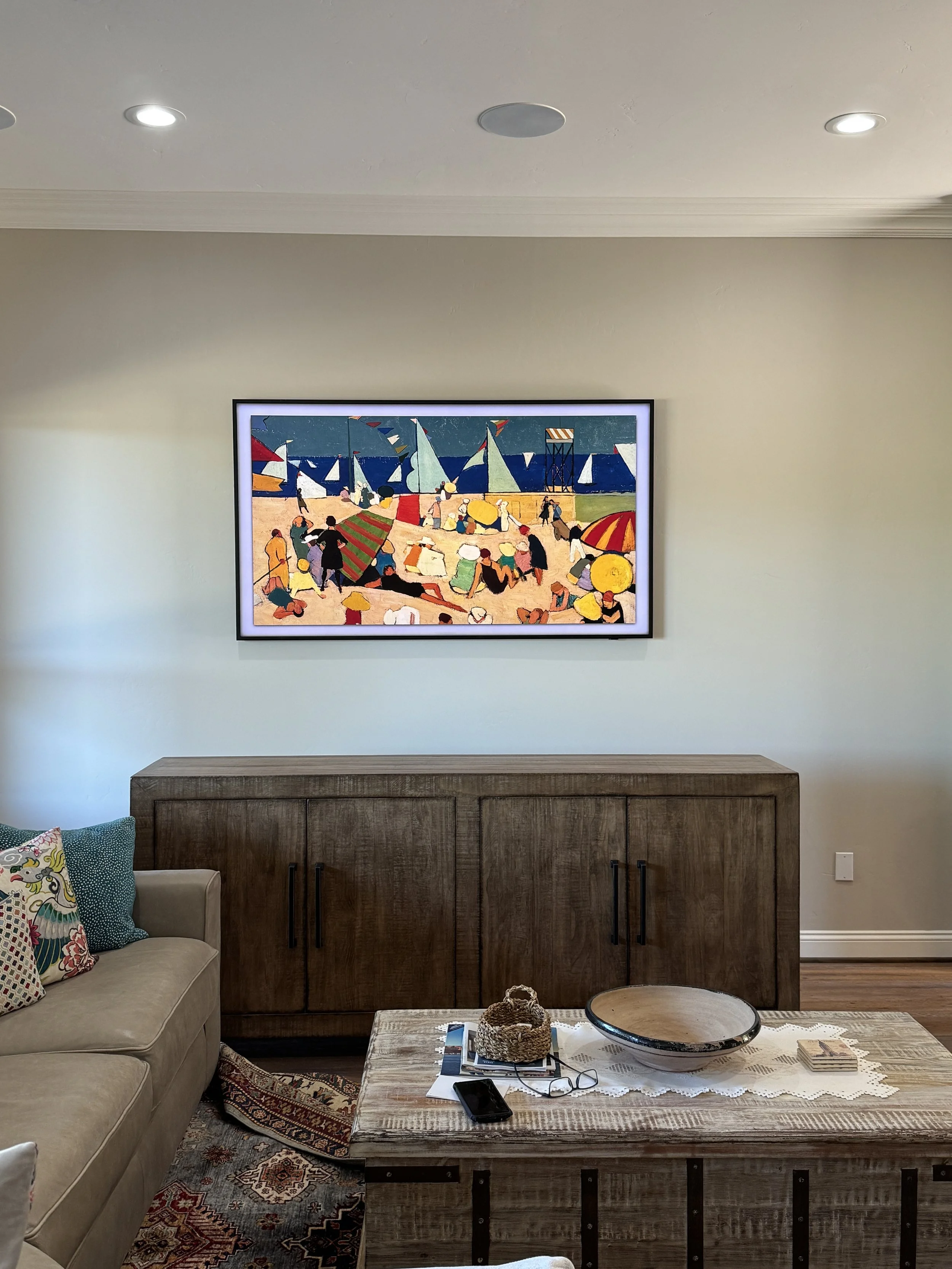 We had fun with color in the TV room, incorporating a bold rug, custom red boucle recliners, and pillows to tie the space together.