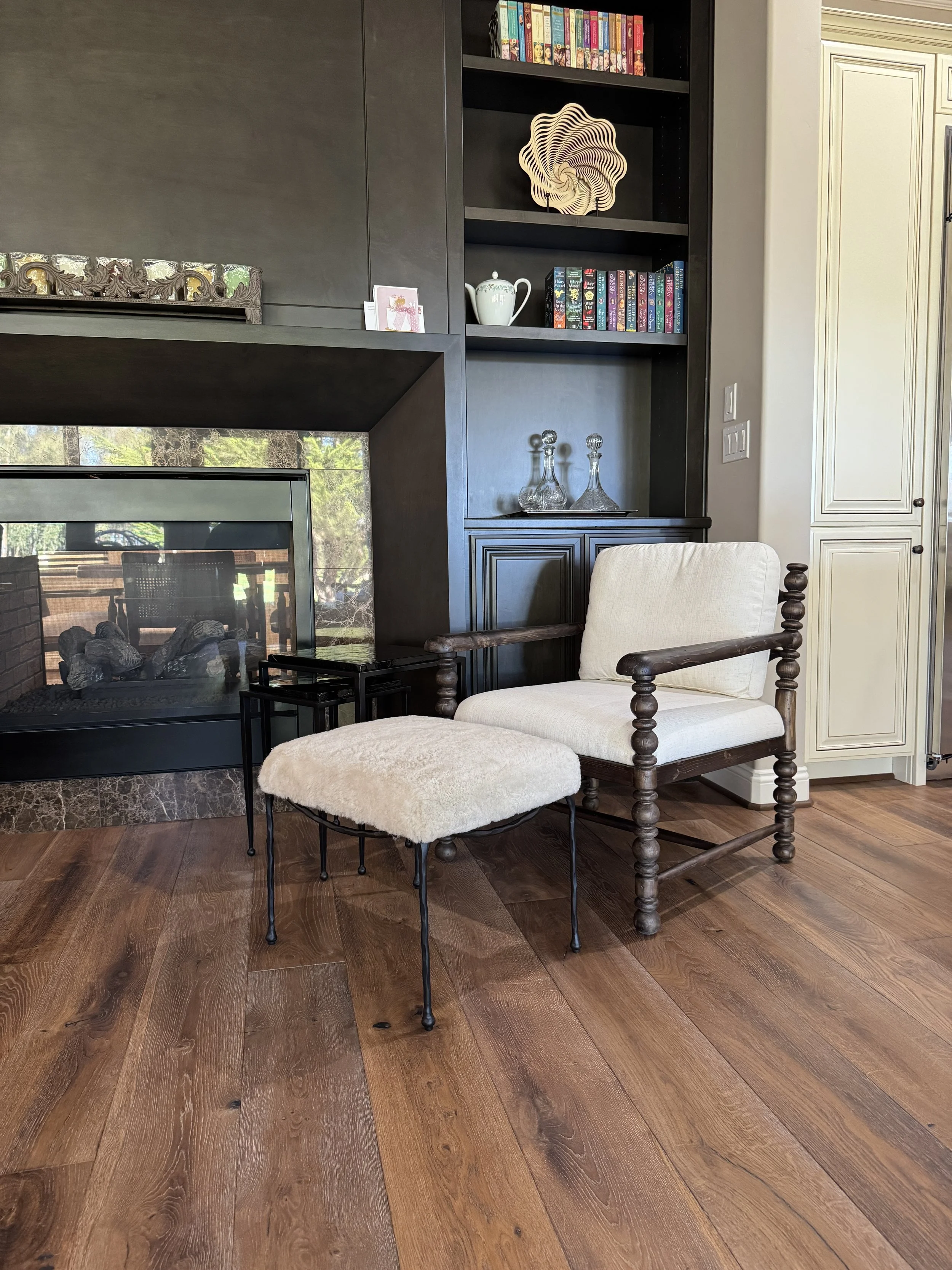 In the family room, we added a new media console and a cozy sitting area by the fireplace.
