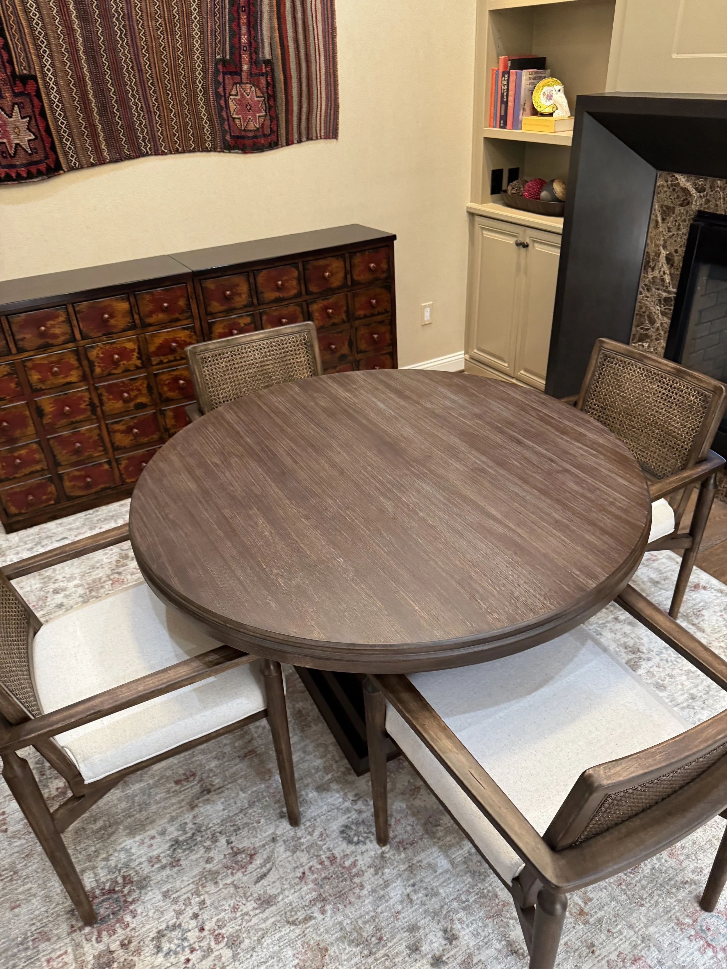 This Mediterranean-style home needed furniture and accessories that would help the owners fully utilize each room. We transformed the unused office into a game room, complete with a pedestal table, chairs, and a fresh rug. Grasscloth wallcovering and a new built-in paint color brought much-needed light and softness to the space.