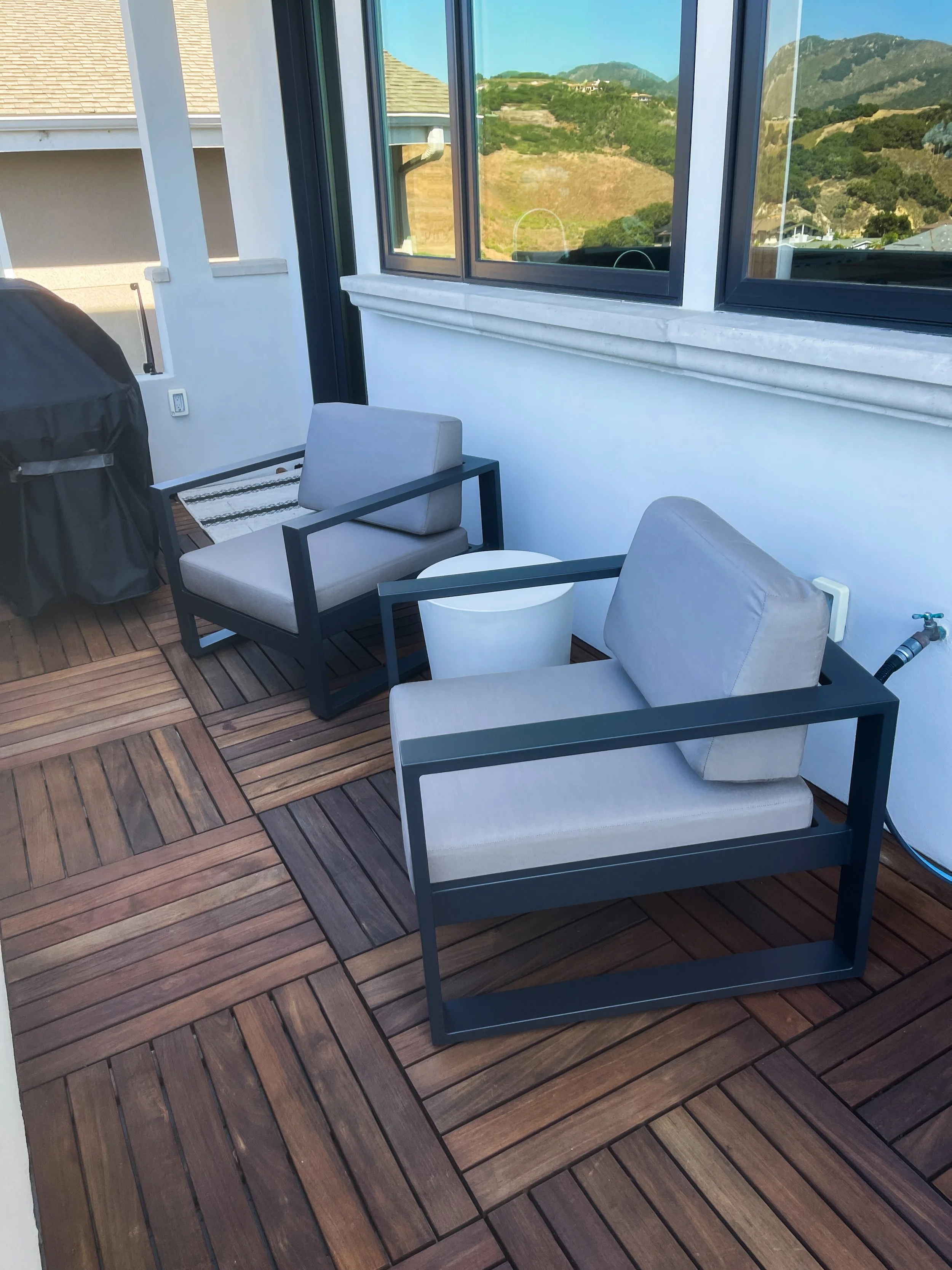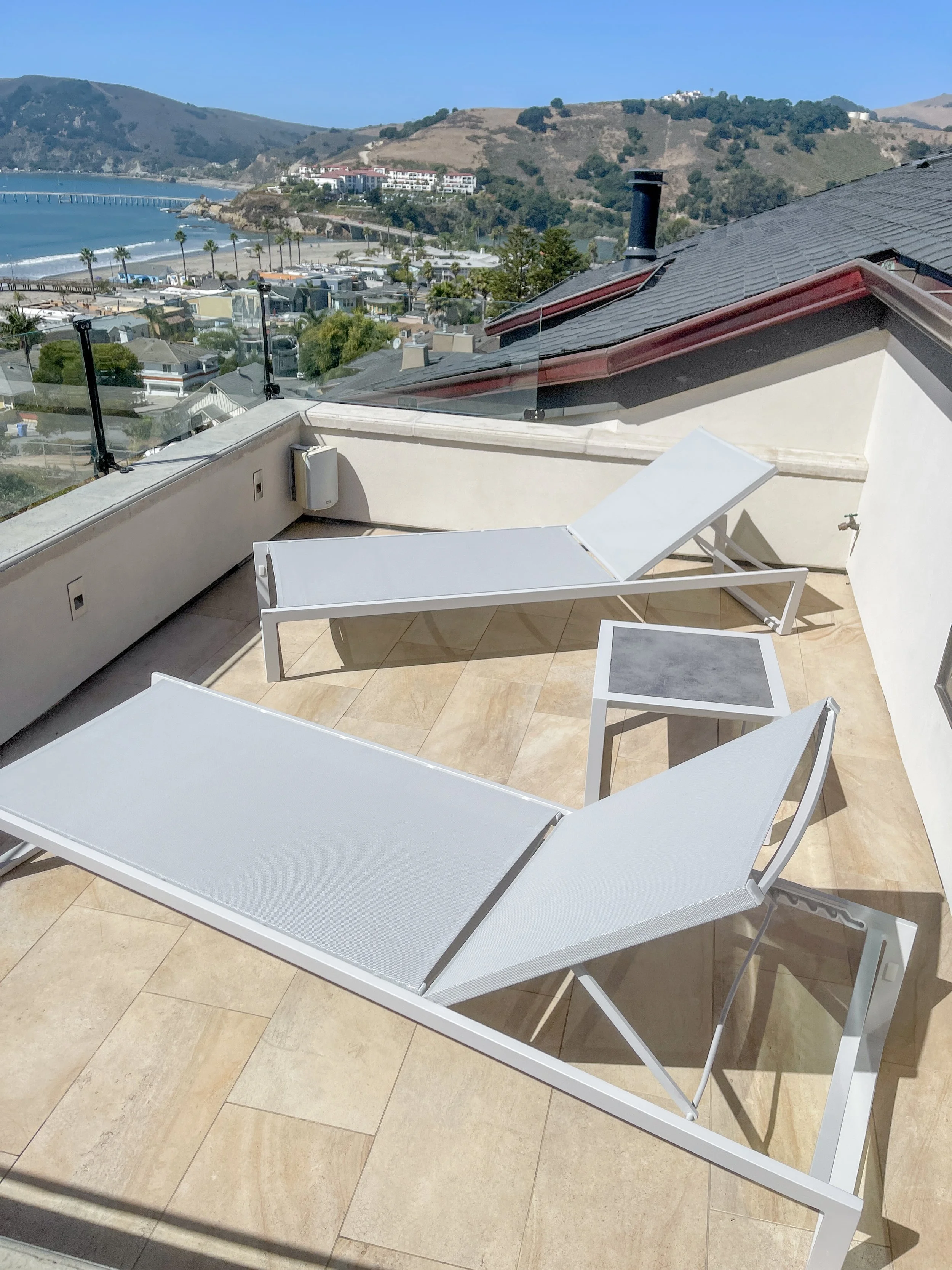 The ceramic-top dining table is perfect for everyday use, but can easily be extended with a center leaf to accommodate larger groups. On the upper level, sun loungers offer the perfect spot to relax and soak in the breathtaking views.